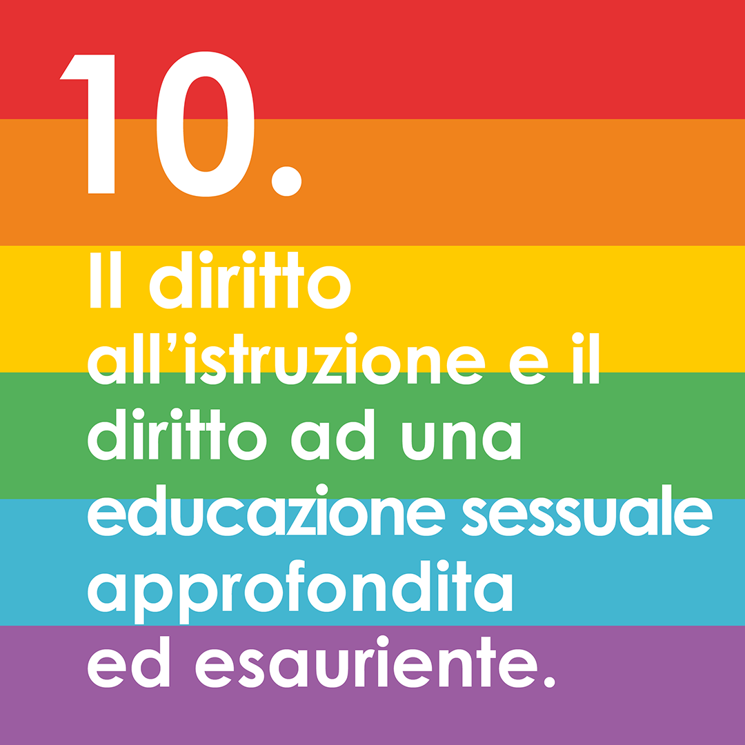 Ogni individuo ha il diritto all’istruzione e il diritto ad una educazione sessuale completa. L’educazione sessuale deve essere appropriata all’età, scientificamente accurata, culturalmente adeguata e basata sui diritti umani, sull’uguaglianza di genere e su un approccio positivo alla sessualità e al piacere.