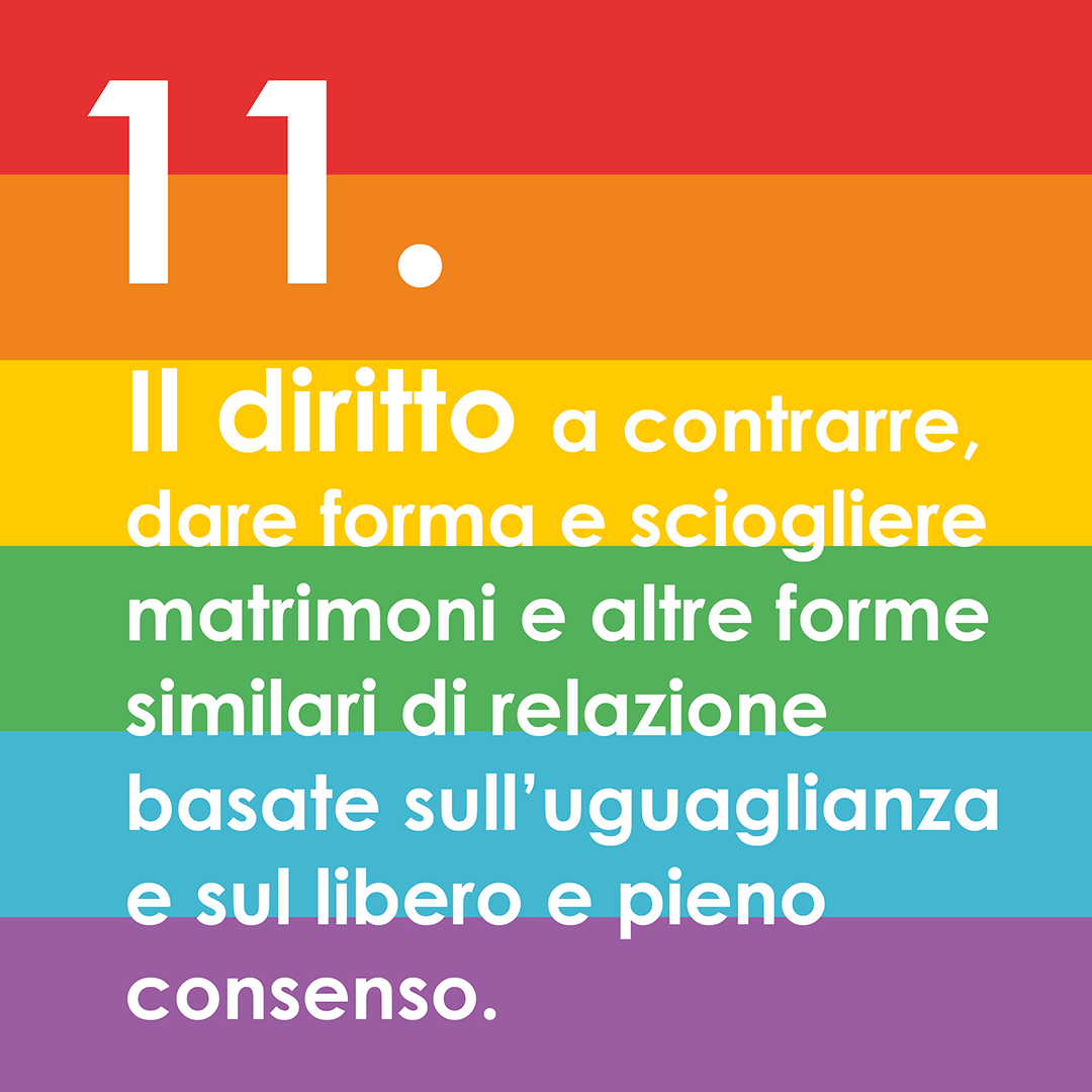 Ogni individuo ha il diritto di scegliere se sposarsi o no e di intraprendere in pieno e libero consenso un matrimonio, una relazione di coppia o altre forme similari di relazione. Tutte le persone hanno gli stessi diritti all’inizio, durante e alla fine di un matrimonio, di una relazione di coppia o altre forme similari di relazione, senza alcun tipo di discriminazione o esclusione. Sono inclusi uguali diritti all’assistenza sociale e ad altri vantaggi indipendentemente dal tipo di relazione.