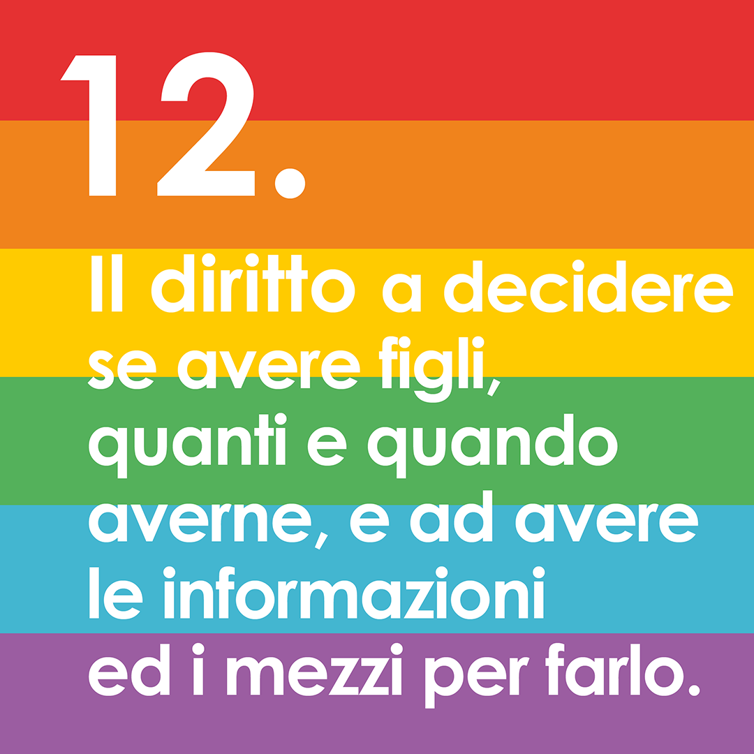 Ogni individuo ha il diritto di decidere se avere figli, il numero e la distanza tra uno e l’altro. Per esercitare questo diritto è necessario avere l’accesso alle condizioni che influenzano e determinano la salute e il benessere, inclusi i servizi di salute sessuale e riproduttiva connessi con gravidanza, contraccezione, fertilità, aborto e adozione.