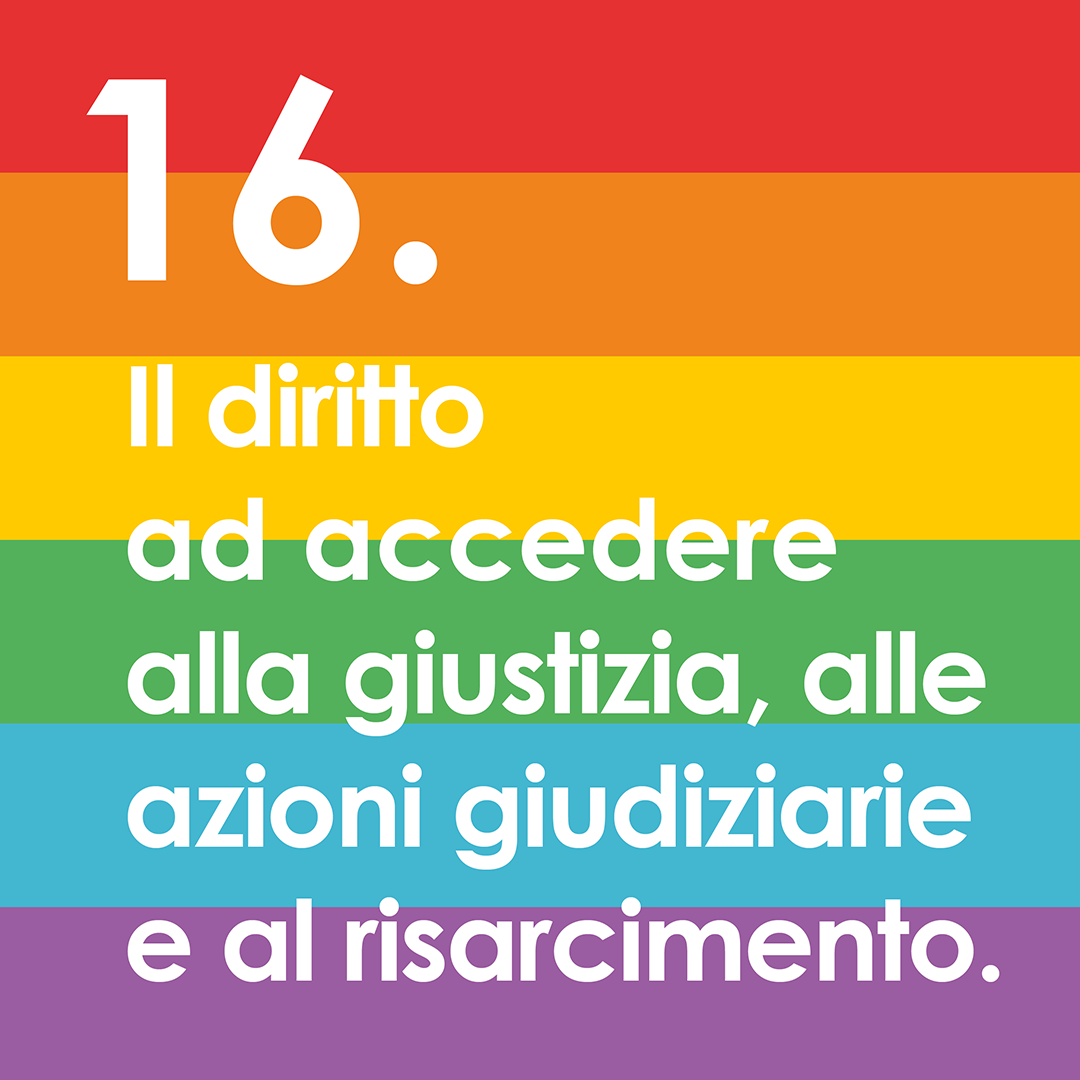 Ogni individuo ha il diritto ad accedere alla giustizia, alle azioni giudiziarie e al risarcimento per le violazioni dei propri diritti sessuali. Questo richiede misure educative, legislative e giuridiche effettive, adeguate, accessibili e appropriate. Le azioni giudiziarie includono il risarcimento attraverso restituzione, compensazione, riabilitazione, soddisfazione e garanzia di non ripetizione.